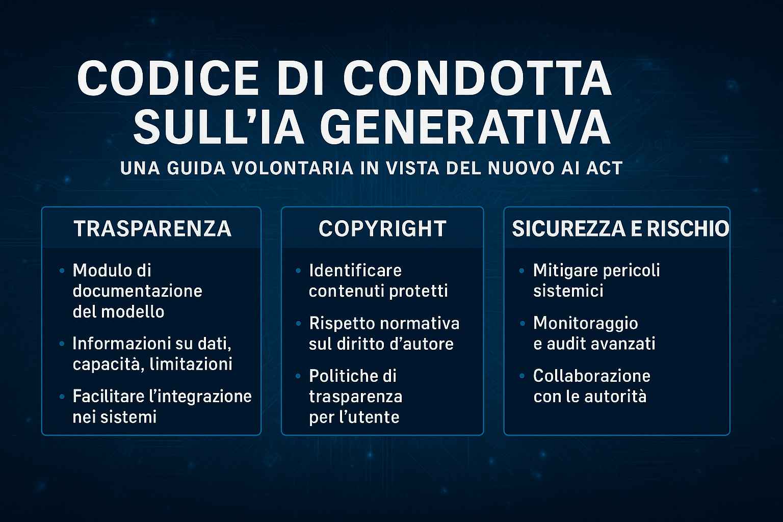 Il codice si concentra sui modelli di IA general-purpose (GPAI): modelli base altamente versatili, utilizzabili per generare testi, immagini, codice, decisioni automatizzate. Tra questi rientrano noti sistemi come GPT, Claude, LLaMA, tecnologie sempre più centrali nella digitalizzazione delle imprese.